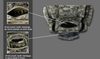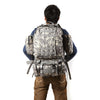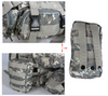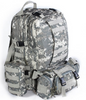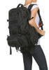 From the front you can see the multiple compartments that are available. The two side pouches and large front pouch are the ones you can interchange with the Molle belt system. To evenly distribute the weight of your backpack, there are a chest and a waist belt available. If you wish to remove some of the Molle pouches, the Molle belts can be used to stabilize larger items such as a fold up chair or sleeping bag.